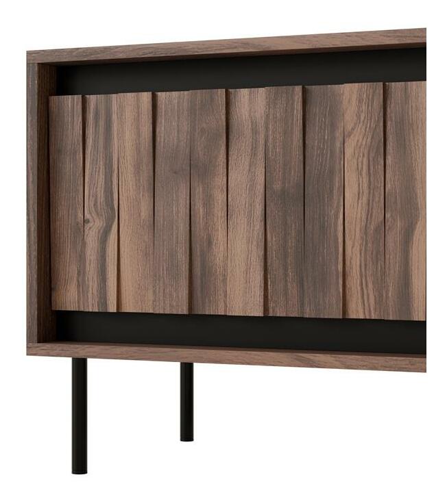 TV skříňka Sting v moderním stylu kombinuje funkčnost s elegantním designem, ideální pro moderní obývací prostory. Vyrobena je z laminované nábytkové desky, což zaručuje její trvanlivost a snadnou údržbu. Skříňka stojí na ocelových nohách s práškovým lakováním v černé barvě, vysokých 14 cm, které zajišťují stabilní základ. Má dvě dveře s vizuálně zajímavými 3D frontami, které přidávají moderní vzhled bez potřeby úchytek, což usnadňuje její estetiku. Skříňka také nabízí prostor pro audio/video zařízení, což umožňuje elegantní a praktické uspořádání vašich multimediálních zařízení. Celkový minimalistický design s čistými liniemi činí z této TV skříňky Sting atraktivní a funkční kus nábytku pro každou současnou domácnost.