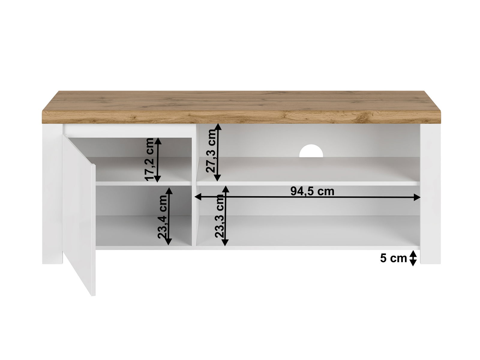 RTV stolek/skříňka Vilgi 1D/160 (lesk bílý + dub wotan) je vysoký 61 cm, široký 156 cm a hluboký 41,5 cm. Tento produkt je skvělým pomocníkem pro lidi, kteří rychle potřebují schovat malý nepořádek, neboť návštěva je již na cestě. Je ideální pro umístění televizoru a multimediálních zařízení. Produkty poskytují dostatek úložného prostoru, včetně dvou polic a jedné skříňky se dvěma dvířky. Současně, skříňka má navíc jednu poličku uprostřed. Produkt má jednoduchý a elegantní design a je barevně kombinován v bílo-hnědém provedení. Produkty jsou vhodné pro každý domov s moderními nároky na nábytek.