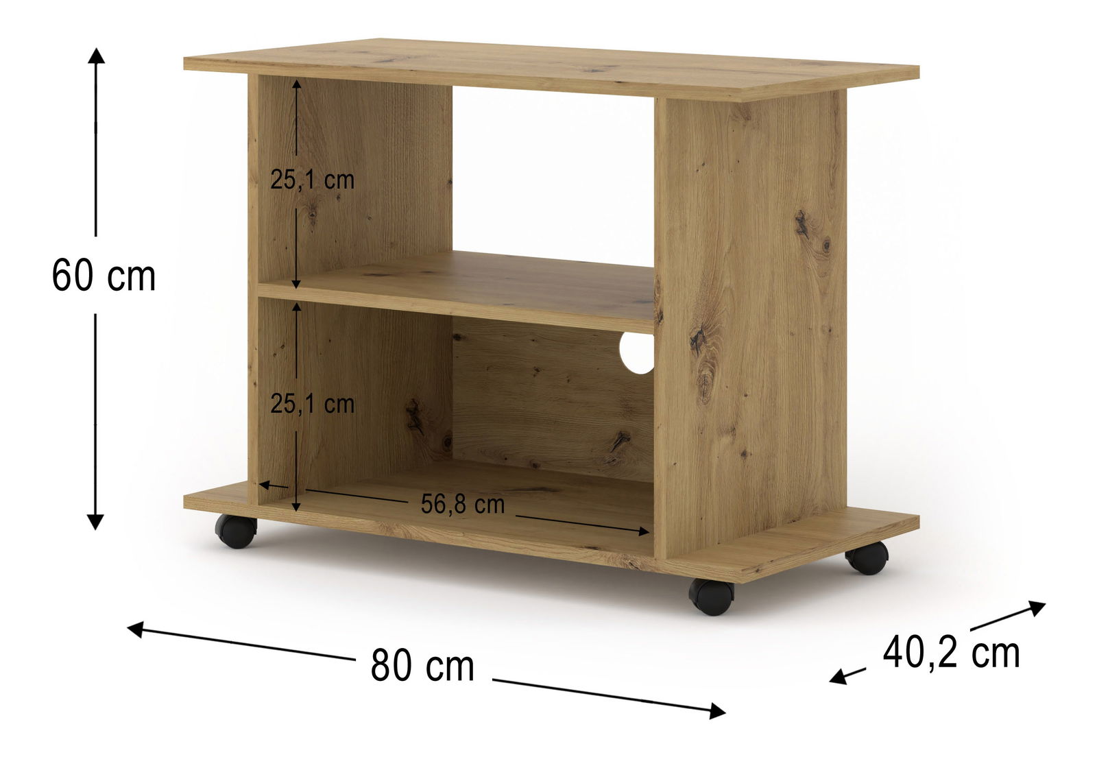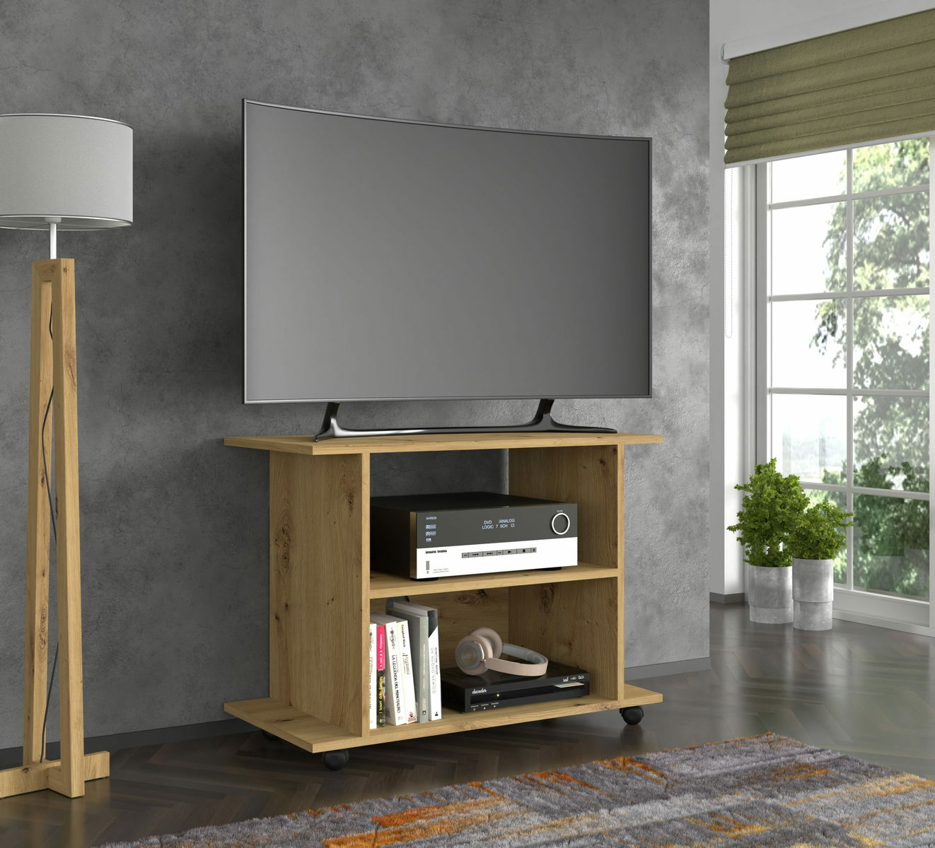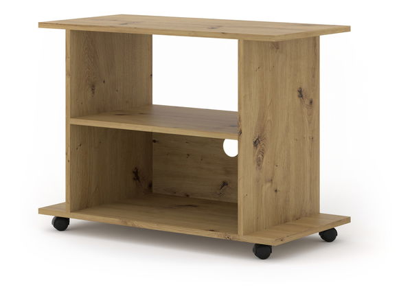 ZobrazitVelice praktická TV skříňka na kolečkách. Ideální do menších obývacích pokojů nebo pokoje pro mládež. Vysoká mobilita skříňky umožňuje volně uspořádat prostor v místnosti. Skříňka má dvě praktické otevřené police na knihy, CD nebo set-top boxy a konzole. Má také otvor pro kabely.