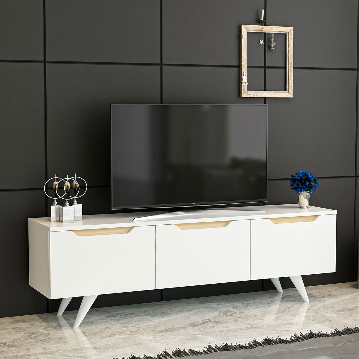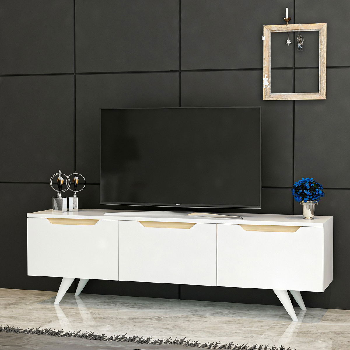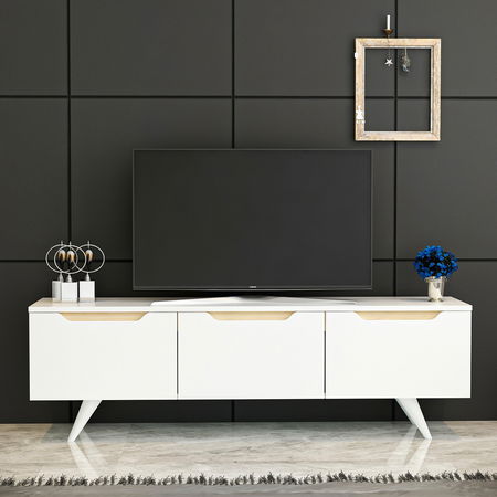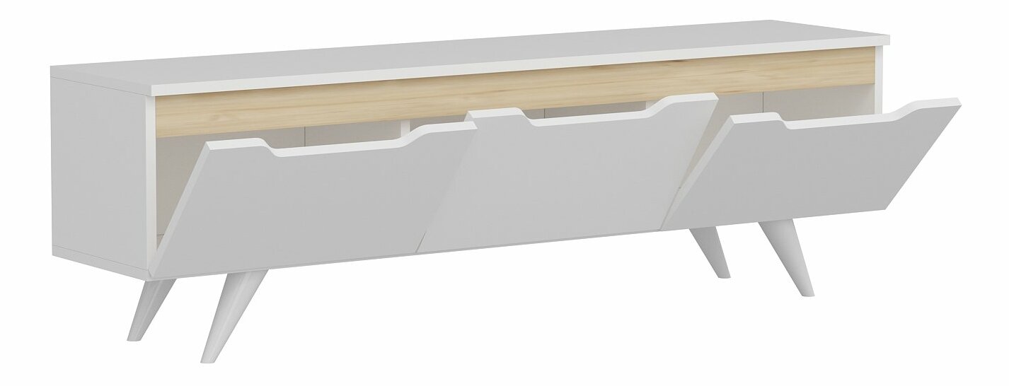 TV stolek/skříňka - Praga (bílá) je vysoký 44 cm, široký 150 cm a hluboký 35 cm. Je vyroben z kvalitní 100% melaminové desky, což zaručuje jeho odolnost a dlouhou životnost. Tento stolek/skříňka je ideálním řešením pro uspořádání vaší televize, DVD přehrávače a dalších multimediálních zařízení. Jeho bílá barva s dubovými detaily vytváří moderní a elegantní vzhled, který se hodí do jakéhokoli interiéru. S dostatečným úložným prostorem a praktickými poličkami vám tento stolek/skříňka pomůže udržet váš obývací pokoj uklizený a organizovaný. Vyberte si tento TV stolek/skříňku Praga a dodejte svému domovu stylový dotek.