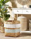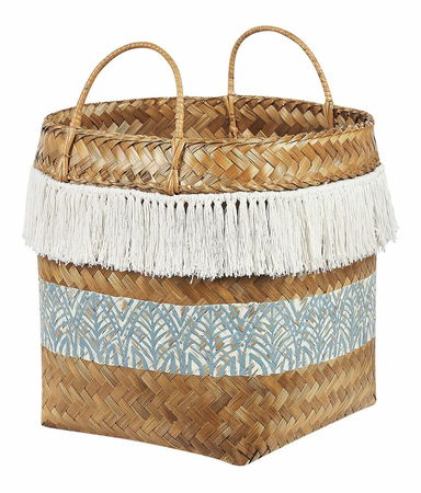 Tento koš v boho stylu jistě upoutá pohledy vašich hostů. Je ručně vyroben z přírodního bambusového dřeva a zejména díky modrému abstraktnímu motivu a bílým bavlněným střapcům je dekorativním doplňkem do interiéru. pokoji.