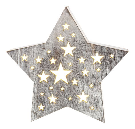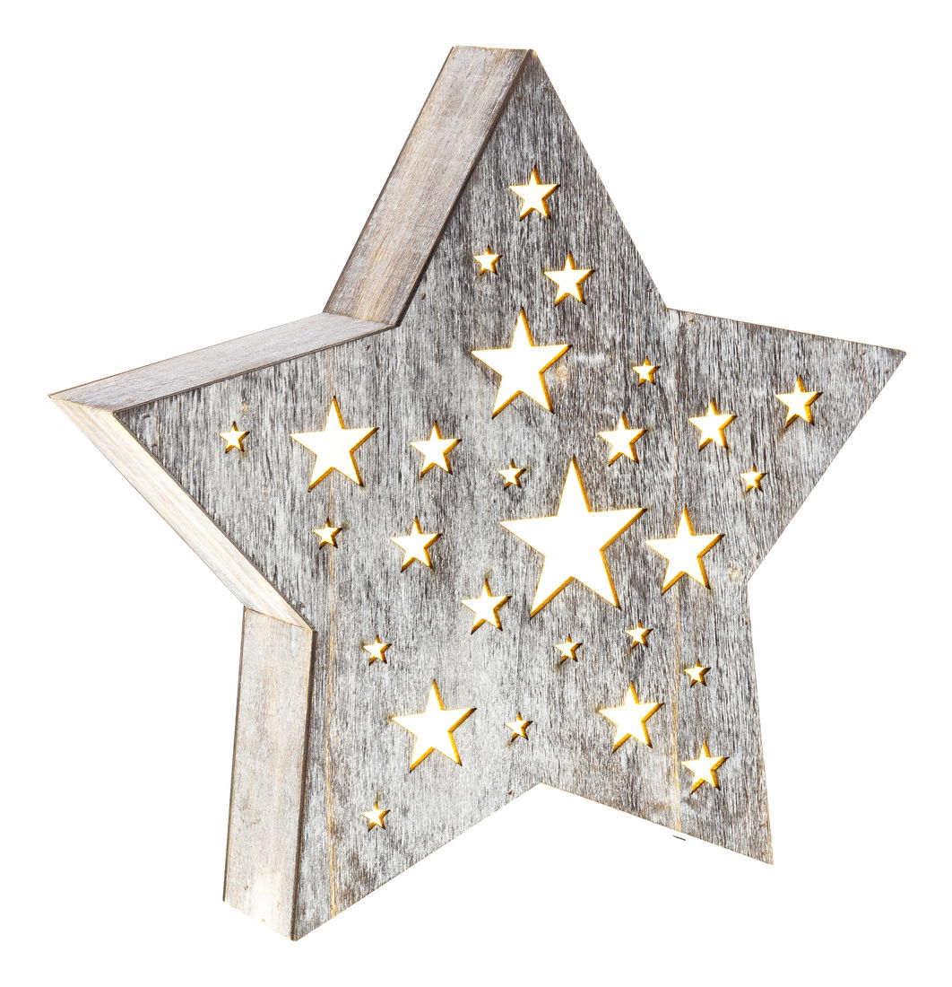 Vánoční dekorace - hvězda dřevěná s perforací ve tvaru hvězdičekrovnoměrné podsvíceníBarva světla: teplá bíláRozměry: 240x 46 x 220 mmVhodné pouze pro vnitřní použití (IP 20)Napájení: 2xAAABaterie nejsou součástí balení