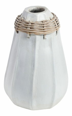 Organický tvar a nepravidelná textura dělají z této vázy jedinečný a výrazný kousek, který vylepší zařízení jakékoli moderní domácnosti. Váza je vyrobena z terakoty a vrchní část zdobí detail z ratanu, který jí dodává nádech přírodního stylu. Jednoduchý design vázy odpovídá současným designovým trendům. Tato bílá váza je klasikou, která se hodí do každého interiéru.