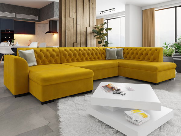 Velká rohová sedačka do obývacího pokoje Emrys spojuje klasiku s moderním stylem. Jednoduchý minimalistický tvar poutá pozornost díky stylovému prošívání, které se pojí s elegancí a luxusem. Možnost výběru z několika barev navíc umožňuje dodat nábytku individuální charakter. Jedinečný design však není všechno. Rohová sedačka do obývacího pokoje se vyznačuje i praktickými řešeními. Byl vytvořen ve tvaru písmene „U“, takže má velmi velkou plochu na spaní, která Vám umožní pohodlně si odpočinout a nabrat síly na další den. Rohová pohovka s funkcí spánku má velký kontejner na ložní prádlo – vejdou se do něj polštáře, přikrývky nebo jiné předměty, které nejsou na očích. Zadní část rohové sedačky je celopotažena látkou, takže ji můžete umístit kdekoli v obýváku. Toto řešení je ideální pro oddělení salonku od jídelního koutu. Rozkládací rohová sedačka je vyrobena z kvalitních komponentů, což zajišťuje mimořádnou odolnost a životnost na léta. Celek je doplněn o dekorační polštářky zapínané na zip. Látka Magic Velvet použitá pro čalounění rohové sedačky je vysoce odolná proti žmolkování a vyblednutí barev - rohová sedačka si zachová svůj dokonalý vzhled po dlouhou dobu. Tato látka je neuvěřitelně jemná a příjemná na dotek a díky vlastnostem sametu se efektivně leskne. Kombinace kvalitní látky a stylového prošívání vytvoří v interiéru něco jedinečného, z čehož jen těžko odtrhnete zrak.
