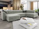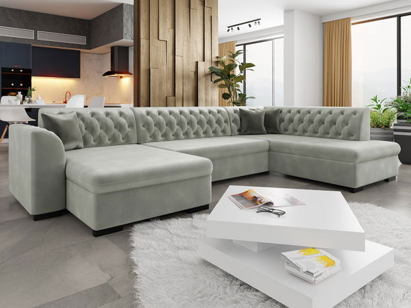 Velká rohová sedačka do obývacího pokoje Emrys spojuje klasiku s moderním stylem. Jednoduchý minimalistický tvar poutá pozornost díky stylovému prošívání, které se pojí s elegancí a luxusem. Možnost výběru z několika barev navíc umožňuje dodat nábytku individuální charakter. Jedinečný design však není všechno. Rohová sedačka do obývacího pokoje se vyznačuje i praktickými řešeními. Byl vytvořen ve tvaru písmene „U“, takže má velmi velkou plochu na spaní, která Vám umožní pohodlně si odpočinout a nabrat síly na další den. Rohová pohovka s funkcí spánku má velký kontejner na ložní prádlo – vejdou se do něj polštáře, přikrývky nebo jiné předměty, které nejsou na očích. Zadní část rohové sedačky je celopotažena látkou, takže ji můžete umístit kdekoli v obýváku. Toto řešení je ideální pro oddělení salonku od jídelního koutu. Rozkládací rohová sedačka je vyrobena z kvalitních komponentů, což zajišťuje mimořádnou odolnost a životnost na léta. Celek je doplněn o dekorační polštářky zapínané na zip. Látka Magic Velvet použitá pro čalounění rohové sedačky je vysoce odolná proti žmolkování a vyblednutí barev - rohová sedačka si zachová svůj dokonalý vzhled po dlouhou dobu. Tato látka je neuvěřitelně jemná a příjemná na dotek a díky vlastnostem sametu se efektivně leskne. Kombinace kvalitní látky a stylového prošívání vytvoří v interiéru něco jedinečného, z čehož jen těžko odtrhnete zrak.