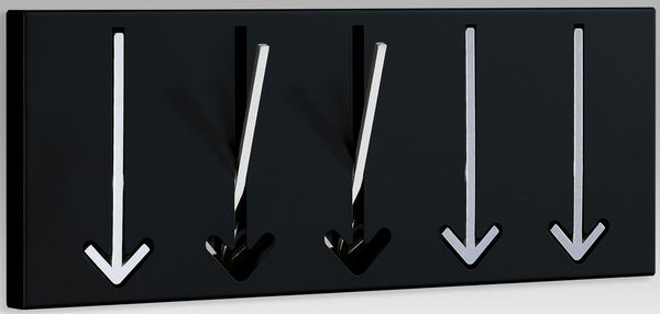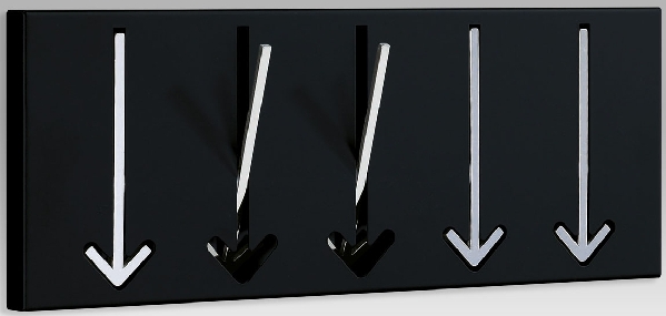 Designový věšák na stěnu. Vybaven je háky, které sá ohýbají po zatlačení na šipku. Háky jsou z kovu, provedení chrom, černá barva desky.
