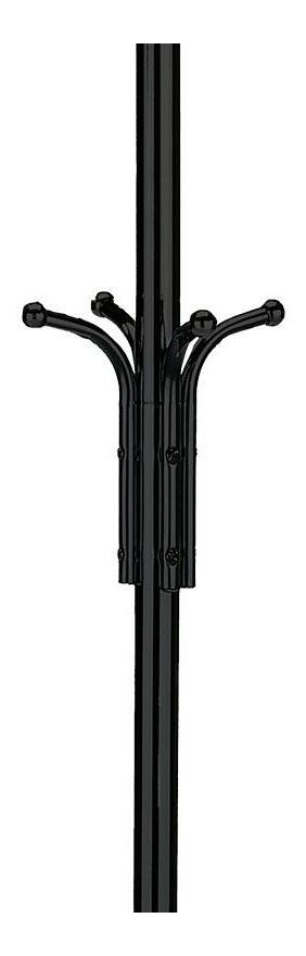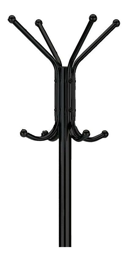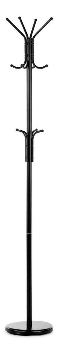 Kovový, volně stojící věšák v retro stylu a se závěsnými háčky ve dvou výškových úrovních. Háčky jsou zakončeny plastovými kulatými záslepkami z černého plastu. Stabilní a lehká konstrukce je z kovových trubek v černém matném práškovém laku a zakončena kovovou podestou se zátěží. Dodáván je v demontovaném stavu. Výška je 182 cm, celková nosnost je do 10 kg rovnoměrně rozprostřené zátěže. Díky své hmotnosti a provedení je snadno přenosný. Jedná se o originální doplněk interiéru, v každém si najde zasloužené a funkční místo a uplatnění.