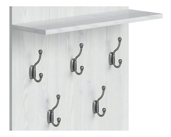 Věšákový panel na stěnu disponuje jednou policí a pěti věšáky. Je vhodný do předsíně. Barevné provedení v severském přírodním dekoru sibiu modřín světlý. Materiál: Nábytková doska.