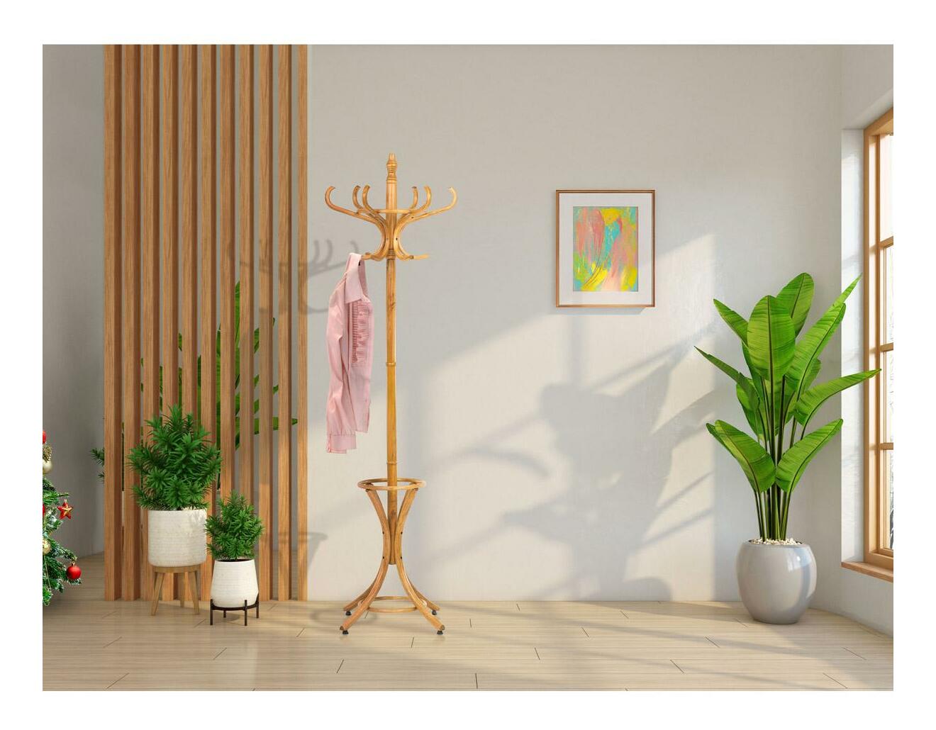 Dřevěný, volně stojící klasický věšák, resp. bestseller mezi věšáky. S jeho designem se setkáváme již několik generací a jeho obliba je nadčasová. O tom svědčí i fakt, že ke svému původnímu účelu – a to věšení oblečení, začal sloužit i jako součást umění. Setkáváme se s ním například. v galeriích a výstavních prostorách, kde jej vidíme jako stojan na zavěšení obrazů nebo je dekorován živými či umělými květinami nebo plastikami. Vyroben je z ohýbaného topolového dřeva, nosná tyč je z břízy, mořený je v odstínu medový dub a lakován transparentním lakem. Výška 185 cm, nosnost je 12 kg rovnoměrné zátěže.