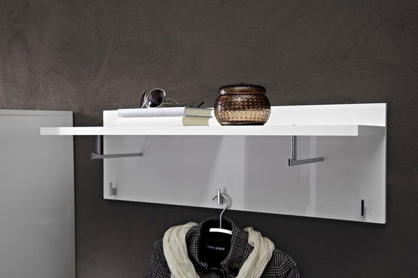 Široký věšák na zeď s dvěma příčnými věšákovými tyčemi umístěnými pod horní poličkou. Po rozích spodní části věšáku jsou umístěny věšáky/háčky/.
