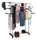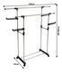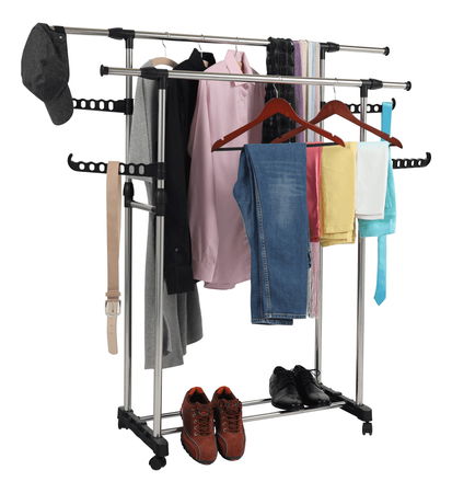 Praktický dvouramenný pojízdný věšák vyroben z nerezového kovu a černé plastové základny. Na obou ramenech se nacházejí doplňkové háky v černé barvě, příčné zpevnění mezi rameny dodávají stabilitu.