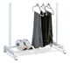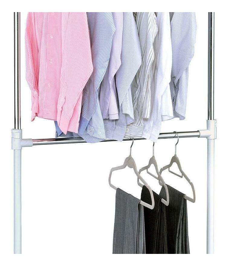 Stojan na šaty dvouramenný (ramena umístěná v konstrukci pod sebou) s pojezdem bez aretace v provedení chrom/bílá barva kovu a plastu a praktickým odkladačem tvořeným dvěma kovovými spojovacími trubkami. Doporučená nosnost je 7 kg rovnoměrně rozložené zátěže na obě ramena dohromady (3,5 kg rameno). Stojan je určen do domácností a není určen pro zátěžový provoz. Výškově nastavitelný. Dodáváno v demontovaném stavu.