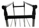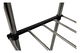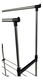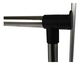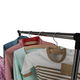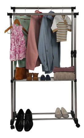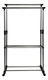 Praktický dvouramenný pojízdný věšák vyroben z nerezového kovu a černé plastové základny, příčné zpevnění je tvořeno doplňkovými tenkými tyčkami umístěnými mezi rameny, které mají dodat stabilitu.