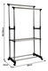 Praktický dvouramenný pojízdný věšák vyroben z nerezového kovu a černé plastové základny, příčné zpevnění je tvořeno doplňkovými tenkými tyčkami umístěnými mezi rameny, které mají dodat stabilitu.