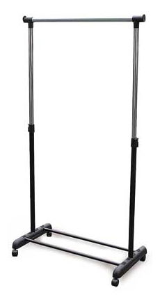 Kovový věšák na kolečkách s jedním ramenem na věšáky s oděvy. Věšák je v barevné kombinaci chromu a černé