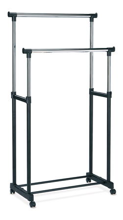 Kovový věšák na kolečkách s dvěma výsuvnými rameny s konstrukcí v barevné kombinaci chromu a černé barvy. Horní ramena se dají rozšířit a poskytnout tak větší odkládací prostor. Plastové prvky spojovací prvky.