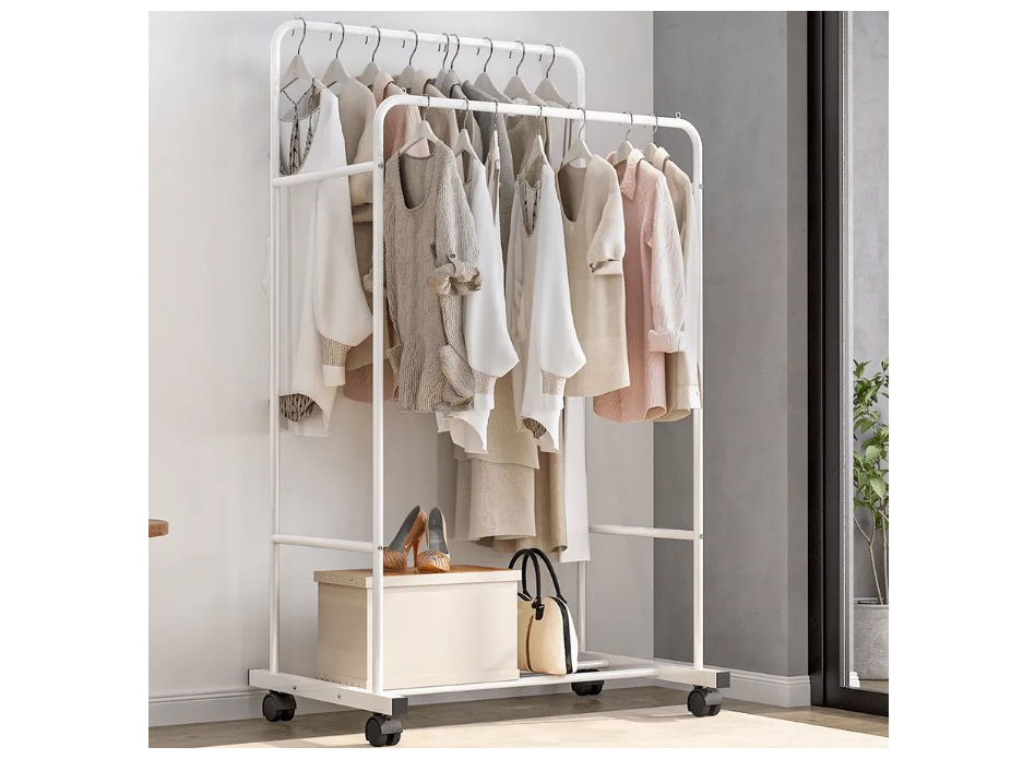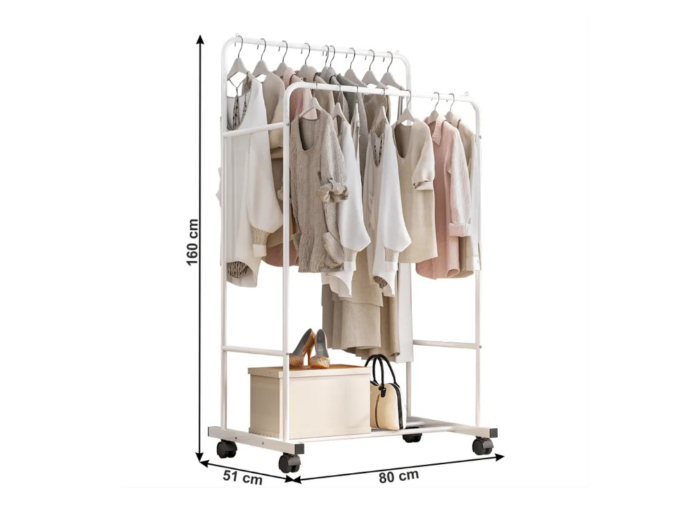 Věšák na kolečkách Illys o výšce 160 cm a hloubce 51 cm je skvělým pomocníkem pro vaše oblečení. Tento dvouřadý věšák má dvě tyče na zavěšení oblečení na ramínkách a police ve spodní části, kde si můžete uspořádat boty, doplňky v boxech nebo i kabelky. Konstrukce je pevná, vyrobena z bílého kovu. S kolečky pro přenášení a dvěma brzdami pro snadnou manipulaci, má nosnost až 22 kg. Věšák na kolečkách Illys je opravdu všestranným stojanem na oblečení, který si zamilujete.