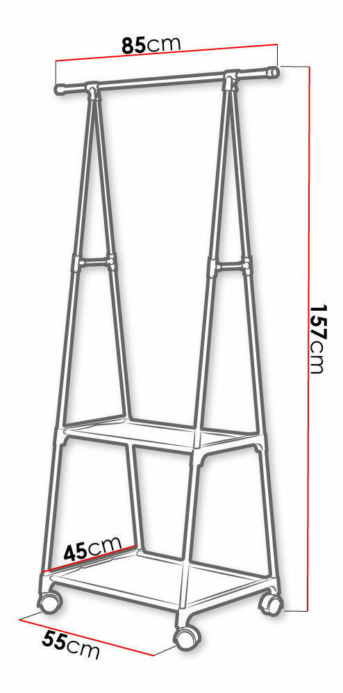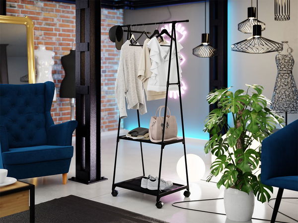ZobrazitVěšák na kolečkách je zajímavým aranžérským doplňkem do domácího nebo veřejného prostoru. Umístíte-li jej do ložnice nebo šatny, lze z něj uložit nejčastěji používané oblečení - budete jej mít vždy po ruce nebo na něm můžete dokončit styling na další den. V hale nebo na veřejném prostranství jej však lze použít jako věšák na kabáty. Věšák je vyroben z lakovaného kovu. Kromě rámu na ramínka nabízí dvě police z polyesteru. Namontovaná kola usnadní jeho pohyb.