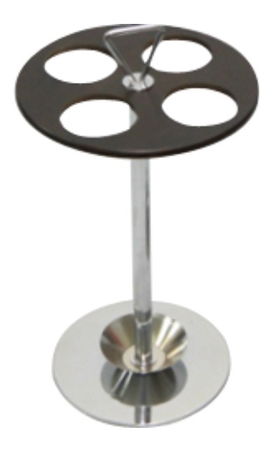 Stojan na deštníky s dřevěnou vrchní kruhovou částí v odstínu ořech. Zbývající části věšáku na deštníky jsou v odstínu chromové barvy.