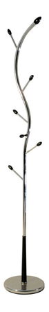 Kovový věšák v chomové barvě s kombinací černé barvy a dřeva v odstínu ořech.