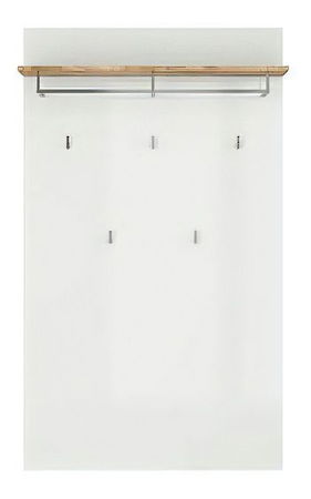 Elegantní věšákový panel s vrchní policí na šály, čepice a pěti praktickými věšáky na kabáty a bundy. Barevné provedení je ve stylu světlého dekoru dubu Westminster s decentními odstíny Bílého lesku nabízí moderní styl do vaší chodby.