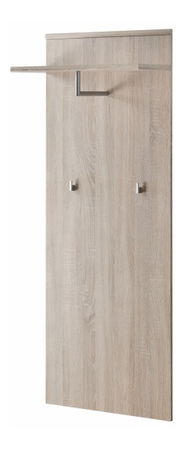 Věšákový panel, který se umisťuje na stěnu. V horní části se nachází jedna polička, pod ní je umístěn věšák a 2 drobné háčky, provedení je dub sonoma.