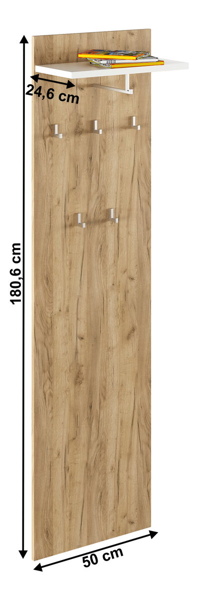Věšákový panel Rumia 19 (dub artisan + bílá) o výšce 180,6 cm, šířce 50 cm a hloubce 24,6 cm je skvělým řešením pro pořádání oděvů. Pomocí panelu si můžete snadno uspořádat kabáty a bundy a udržet si pořádek. Vyroben je z kvalitní DTD laminované ve velmi příjemné kombinaci dub artisan a bílá. S tímto panelem získáte nejen praktický prvek do svého interiéru, ale také moderní a atraktivní design. Panel Rumia 19 je opravdu vynikající pomocník pro každého, kdo chce udržet pořádek a zlepšit vzhled svého domova.