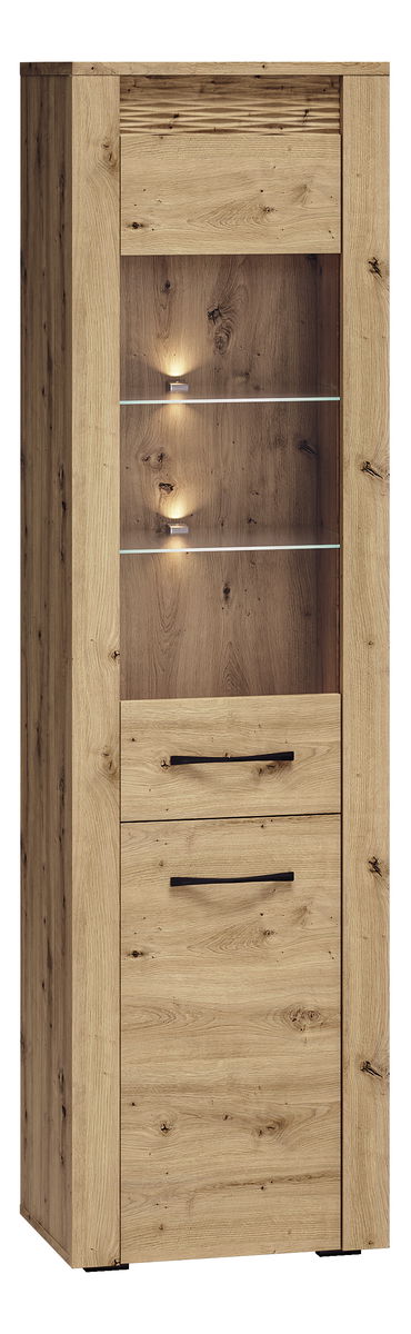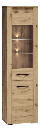 ZobrazitVitrína Anika 3 se dvěma otevřenými policemi a dvěma uzavřenými zásuvkami nesmí chybět ve vašem interiéru. Moderní design vitríny dotváří krásné hranaté tvary. Barevné provedení je ve stylu krásného dekoru dubu artisan.