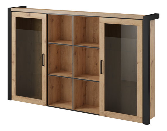 Nástavbu na komodu se skleněnými dvířky Armin můžete využít i jako samostatnou vitrínu. Skládá se ze dvou hlavních částí. Ve středu se nacházejí menší otevřené police az krajů jsou skleněná dvířka, za kterými jsou skleněné poličky. Vitrínu můžete využít k úschově sošek, svíček nebo jiných dekorací. Vitrína je vyhotovena v příjemném dřevěném dekoru dub taurus s elegantním černým orámováním. Úchytky dvířek jsou úzké a také v černém provedení. K vitríně lze dokoupit i LED osvětlení.