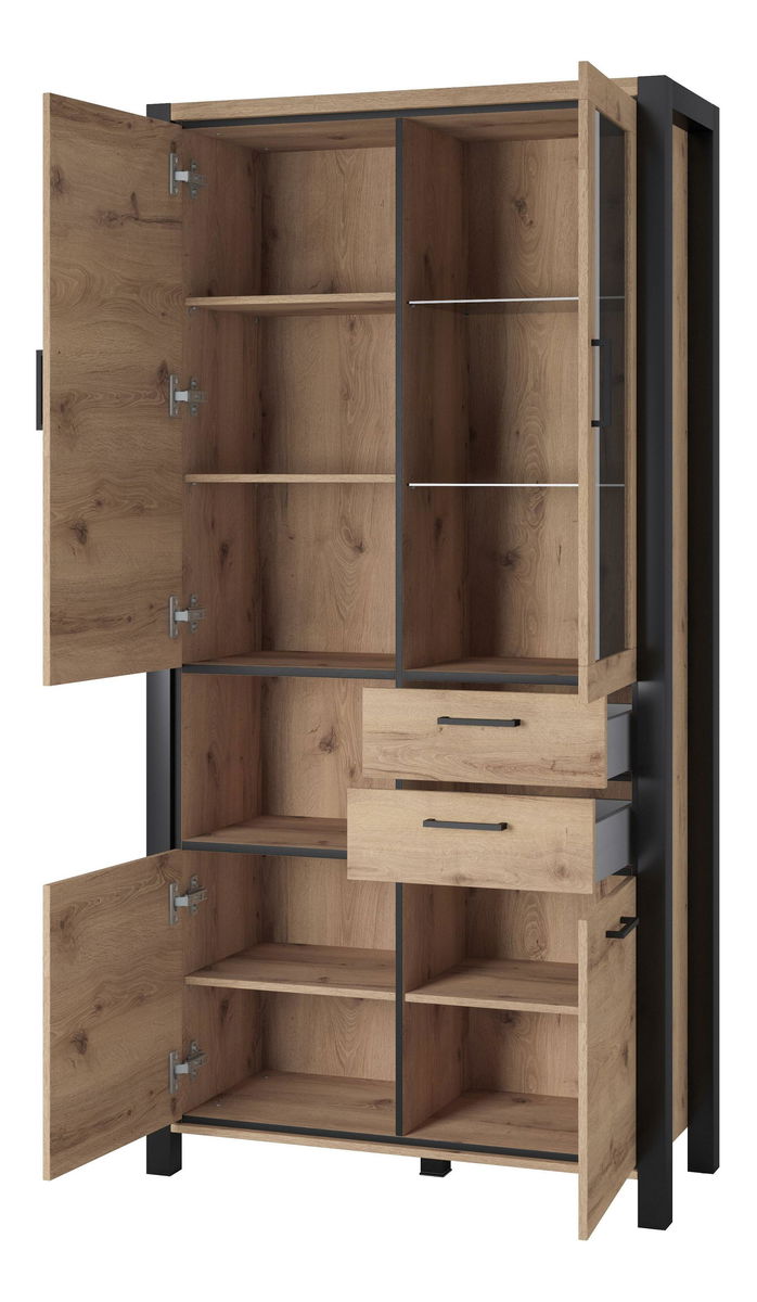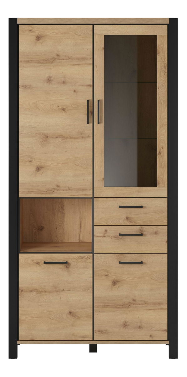 Zajímavá vitrína Armin s jedněmi skleněnými dvířky. Sestavení vitríny je netradiční, a to jí dodává na exkluzivitě. Vitrína má tedy prosklenou část, otevřený box, zásuvky, ale také prostor ukrytý za plnými dvířky. Její využití je proto všestranné. Vitrína je vyhotovena v příjemném dřevěném dekoru dub taurus s elegantním černým orámováním a nožičkami. Úchytky dvířek a zásuvek jsou úzké a také v černém provedení. K vitríně lze dokoupit i LED osvětlení.