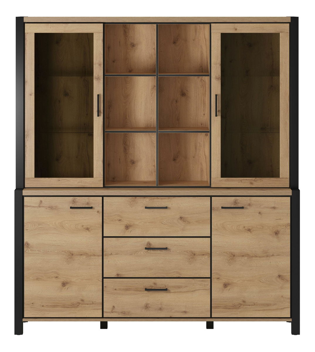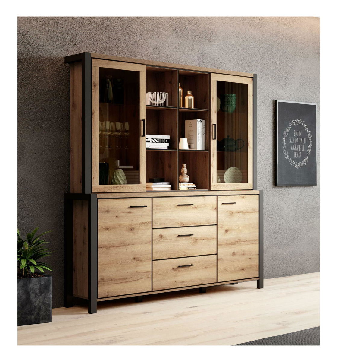 Sestava horní vitríny a spodní komody Armin je zárukou velkorysého prostoru pro odkládání věcí. Tuto sestavu můžete využít v obývacím pokoji, ale iv jídelně či v kuchyni jako kredenc. Horní část se skládá z otevřených polic, skleněných polic a skleněných dvířek. Spodní část je sestavena ze zásuvek a plných dvířek. Sestava je vyhotovena v příjemném dřevěném dekoru dub taurus s elegantním černým orámováním a nožičkami. Úchytky dvířek a zásuvek jsou úzké a také v černém provedení. K vitríně lze dokoupit i LED osvětlení.