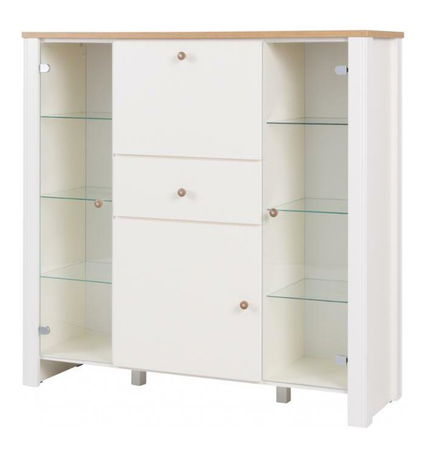 Třídílná vitrína Berkeley s prosklenými dvířky. Uvnitř se nacházejí skleněné poličky, které se dají podsvítit LED osvětlením. Uprostřed vitríny se nacházejí horní a dolní dvířka a jedna zásuvka.