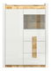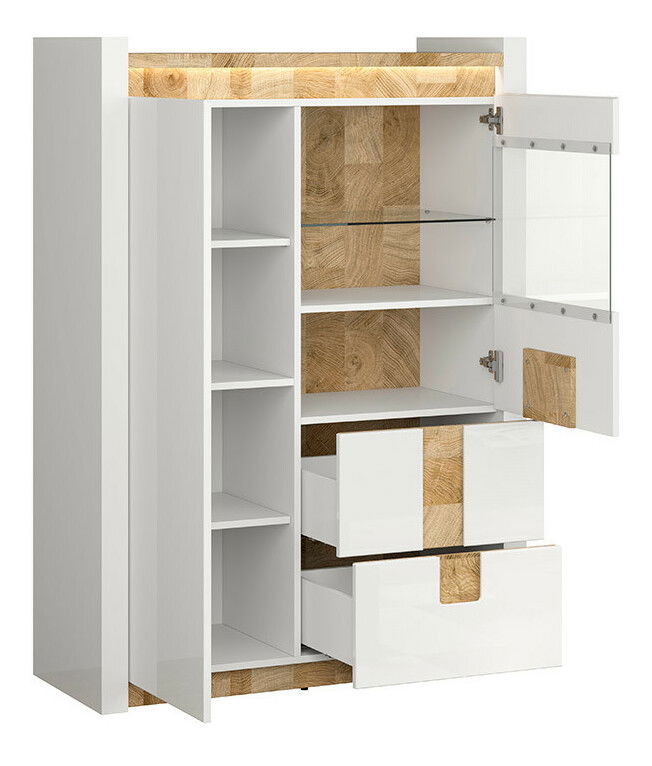 Zpestřete si obývací pokoj krásnou vitrínou s přírodními prvky. Potěší Vás i úložným prostorem, kterým disponuje. V levé části se za dvířky nacházejí tři police. Za částečně prosklenými dvířky se nachází jedna skleněná a jedna plná police. Další úložný prostor Vám poskytnou i dvě prostorné zásuvky. Dekorativní prvek na čele zásuvek slouží jako stylová rukojeť. Dvířka vitríny mají panty s tichým dojezdem.