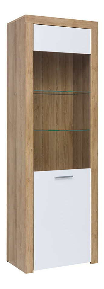 Moderní vitrína vhodná do obývacího pokoje, či pracovny Vám poskytne prostor pro Vaše oblíbené dekorace, sklo, či porcelán. V její horní prosklené části se nacházejí dvě skleněné poličky. Dvířka mají tenčí podlouhlý úchyt.