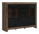 Vitrína nabízí dvě zásuvky ve vrchní části, jednu dveřovou skříňku, která má uvnitř jednu polici. Na krajích se nacházejí vitríny, které mají průhledná dvířka s tichým dorazem. Barevné provedení se nese v přírodním dekoru dubu klášter a černého dubu. Barevný mix přírodních dekorů dokonale sluší každému milovníkovi moderního a elegantního interiéru. Materiál: Nábytková deska. Nábytek disponuje bezúchytové otevíráním dvířek a při objednat si můžete LED osvětlení, ale také disponuje systémem tichého zavírání dvířek.
