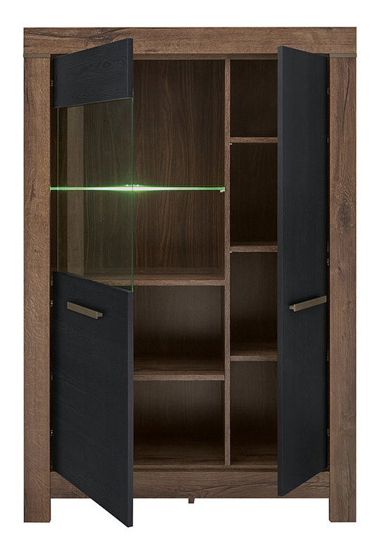 Vitrína Balin s LED podsvietením poličky upozorňuje na vystavené dekorace, fotky a další drobnosti. Vitrína má dvě dvířka, jedny jsou z části presklenné. Za oběma dveřmi se nacházejí praktické poličky. Elegantní vitrína je vyrobena z dřevěných laminovaných desek. Dvierka mají systém tichého dovierania.