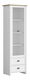 Úzká vitrína v provensálském stylu s kovovými úchyty. Vitrína obsahuje dvě zásuvky na válečkových kolejničkách a čtyři police s maximální nosností 4 kg.
