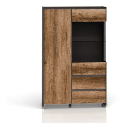 Obývací pokoj víte jednoduše přetvořit na útulný a moderní prostor. Vitrína s moderním designem vám poskytne dostatek úložného prostoru a zároveň zvýrazní vaše oblíbené dekorace a doplňky. Pro větší efekt má vitrína i osvětlení. Vitrína má na levé straně dvířka a na pravé zásuvky ve spodní části. Dvířka a zásuvky nemají úchyty.