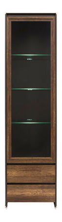 Vysoká vitírna s prosklenými dvířky a skleněnými poličkami. Skleněné poličky jsou podsvícené, čímž se krásně zvýrazní všechny dekorace a doplňky, které do vitríny umístíte. Ve spodní části vitríny se nacházejí dvě menší zásuvky. Dvířka a zásuvky vitríny nemají úchyty.