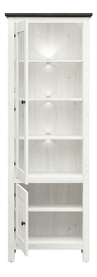 Vitrína Hesen poslouží k uskladnění knih, drobností a nejcennějších doplňků. Patříte mezi příznivce odpoledních setkání u čaje? Ve skříňce najdete místo také na oblíbené sady šálků, ze které použijí domácí a hosté, kteří vás navštíví. Úzká vitrína o rozměrech 71 × 203 cm obsahuje: 3 police umístěné za skleněnou frontou z tvrzeného skla, skříňku s 1 policí, která dělí vnitřek na 2 přihrádky. Spolu s elegantní konstrukcí nábytku jde také elegantní barevnost. Vzor napodobující strukturu dřeva a kulaté úchytky působí jako jemné ozdoby. Viditelné police jsou vybaveny LED osvětlením, díky kterému výrazné dekorace neuniknou nikomu. Standardně jsou zahrnuty i panty se zabudovaným tichým zavíráním.