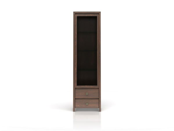 Vaše oblíbené dekorace a doplňky najdou své místo v této krásné vysoké vitríně rustikálního designu. Vitrína má kromě prosklených dvířek a poliček i dvě menší zásuvky ve spodní části. Zásuvky vitríny mají kovový čtvercový úchyt.