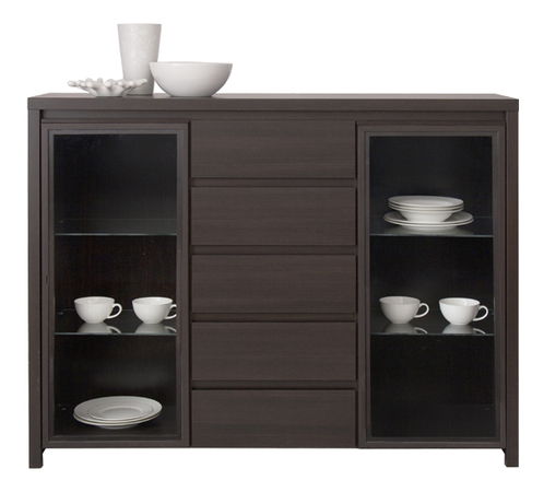 Krásná vitrína minimalistického designu s jemnými liniemi. Bude krásným doplňkem vašich obývacích pokojů, jídelen nebo pracoven. V levé a pravé části se nacházejí prosklená dvířka, kam si můžete umístit porcelán, dekorativní předměty a jiné doplňky. Uprostřed je pět zásuvek. Zásuvky mají svrchu seříznuté hrany pomocí kterých se otevírají.