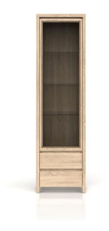 Úzká elegantní vitrína s prosklenými dvířky, třemi skleněnými poličkami a dvěma zásuvkami ve spodní části. Určitě vás osloví jednoduchým, ale elegantním designem. Vitrína je vhodná pro všechny vaše dekorace, doplňky nebo porcelán.