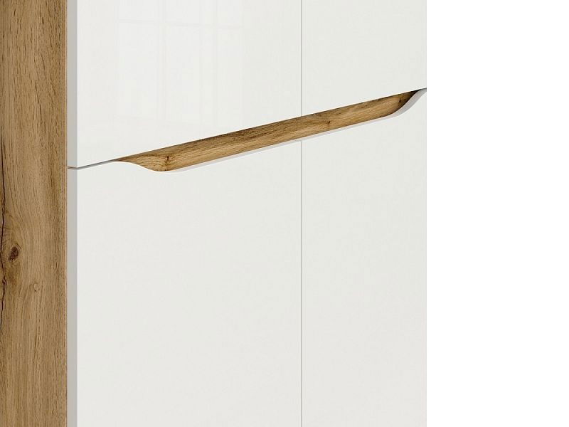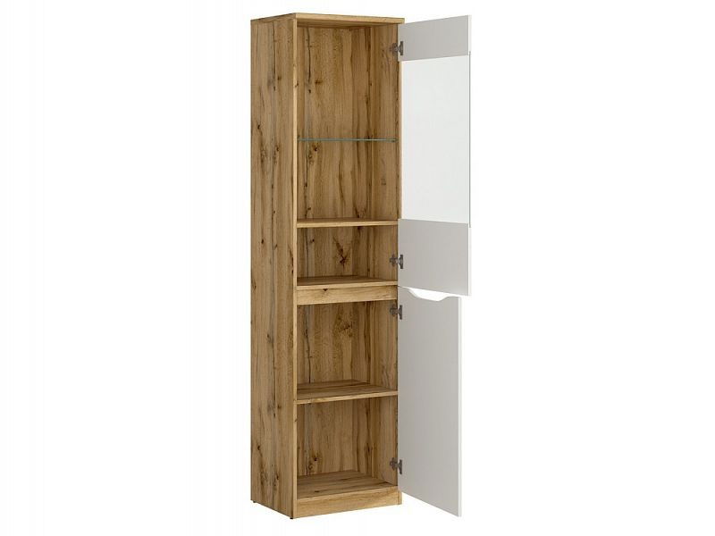 Vysoká vitrína obsahuje 1 plné a 1 prosklená dvířka. Ve vrchní části se nachází 1 skelná a 1 plná police. Ve spodní části je k dispozici 1 plná police. Maximální nosnost plné police je do 4 kg a skelné do 2 kg. Dodávána v demontu.