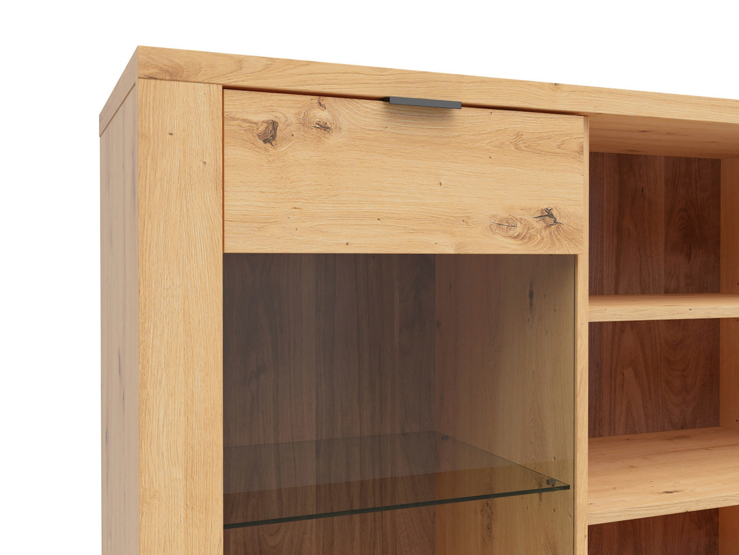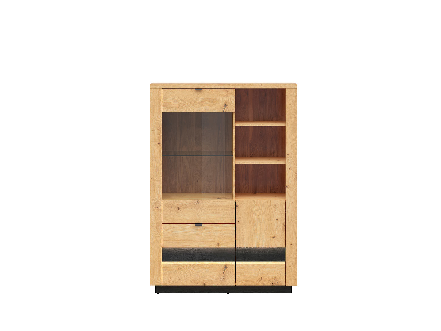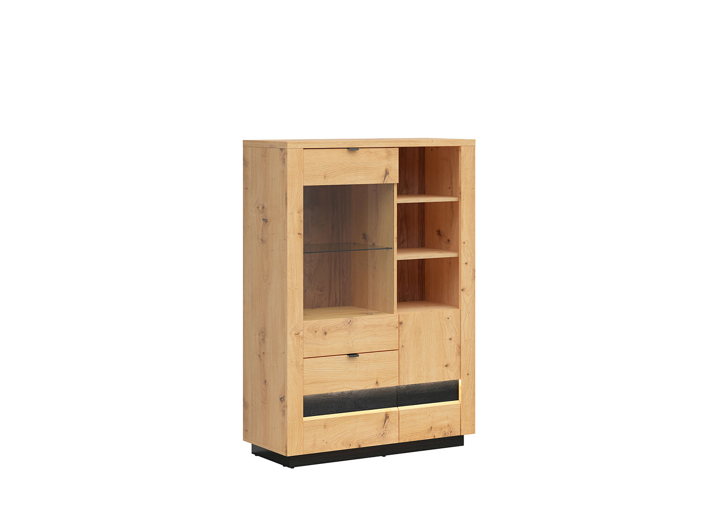 Prostorná vitrína z kolekce Ostia nabízí úložný prostor v podobě 2 zásuvek a 1 skříňky. K dispozici máte také 2 otevřené police. Úroveň komfortu podporuje tiché zavírání dvířek a zásuvek. Minimalistické úchytky v matné černé usnadňují způsob otevírání.
