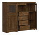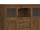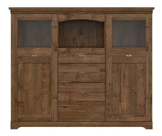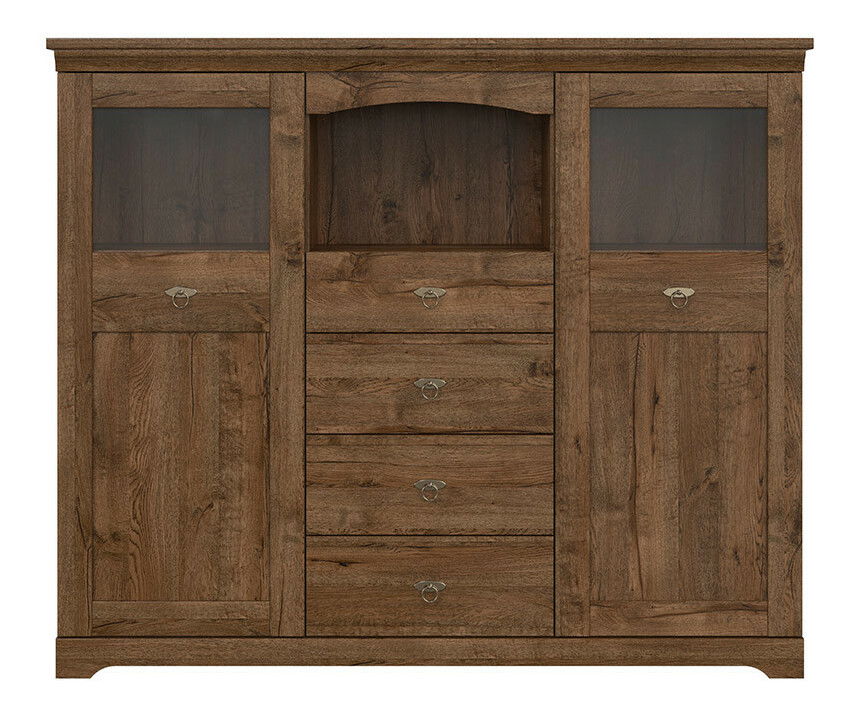 Nádherná vitrína s retro nádechem osloví zejména příznivce klasického stylu nábytku. Působí však svěže a tmavší barevné provedení s výraznou kresbou dřeva jí dodává eleganci. Vitrína je rozdělena na tři části. V skříňkách na levé a pravé straně jsou dvě plné police. Průhledná část vitrínová dvířek je z bezpečnostního tvrzeného skla. Střední část vitríny má čtyři zásuvky na válečkových kolejničkách a jednu otevřenou polici. Vitrína má závěsy s tichým dojezdem s regulací brzdné síly.