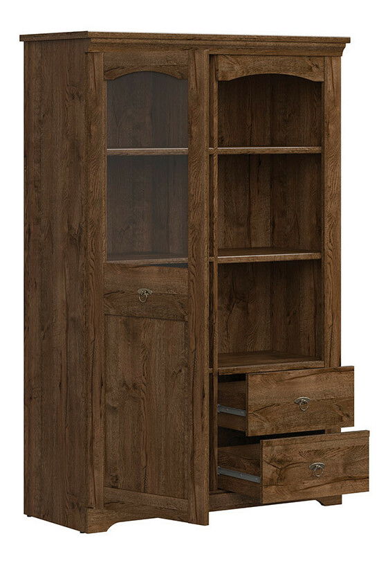 ZobrazitNádherná vitrína s retro nádechem osloví zejména příznivce klasického stylu nábytku. Působí však svěže a tmavší barevné provedení s výraznou kresbou dřeva jí dodává eleganci. Vitrína je rozdělena na dvě části. V levé části jsou dvířka a uvnitř se nacházejí tři plné police. Průhledná část vitrínová dvířek je z bezpečnostního tvrzeného skla. V pravé části se nacházejí dvě zásuvky a dvě otevřené police. Vitrína má závěsy s tichým dojezdem s regulací brzdné síly.