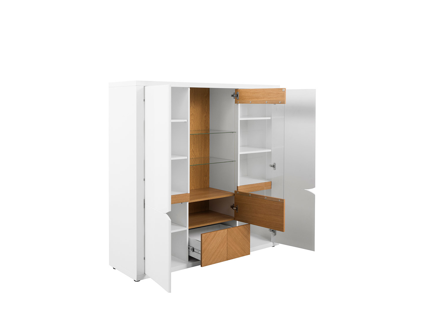 Originální vitrína z kolekce Roviko. Ozdobný porcelán, fotografie a jiné dekorace si můžete vystavit ve vitríně za skleněnými dvířky. Ještě více jich zvýrazní LED osvětlení. Ostatní věci snadno schováte do 2 skříněk za plnými dvířky nebo do 1 praktické zásuvky. Úroveň při každodenním využívání potvrzuje funkce tichého zavírání dvířek a zásuvek. Bezúchytkové otevírání zásuvek díky funkci "push to open".