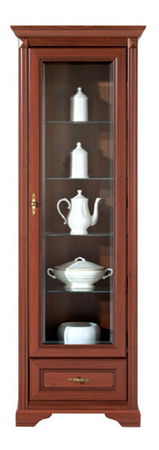 Patinování, vzor intarsie, zhotovený technikou serigrafie, bohatě vyřezávané dvířka, sokl, vlisy a lišty, použití v klasické sestavě nábytku v barvě třešeň antik. Vše vyrobeno pomocí moderní technologie, což umožňuje překvapivě atraktivní ceny při velkém objemu zdobení. 34 prvků v barvě třešeň antik.