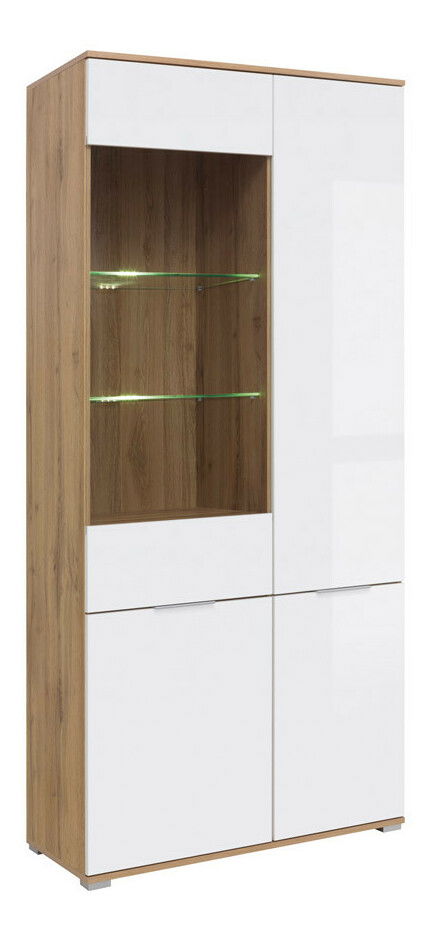 ZobrazitVysoká vitrína bude nádhernou ozdobou ve vašem obývacím pokoji nebo pracovně. Za jedněmi skleněnými a třemi plnými dvířky se ukrývá spousta poliček, kam si můžete odložit sklo, dekorace a různé drobnosti. Levá část je z části prosklená a má dvě skleněné poličky. K této vitríně si můžete přiobjednat také energeticky úsporné osvětlení, které krásně zvýrazní doplňky uvnitř. Nosnost skleněné police je 2 kg, nosnost ostatních polic je 5 kg.